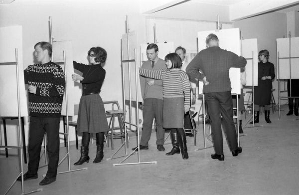 Anja Hyttinen (kuvassa neljäs vasemmalta) opettaa mallinpiirustuskurssilla. Kuva Savon Sanomat 24.11.1965