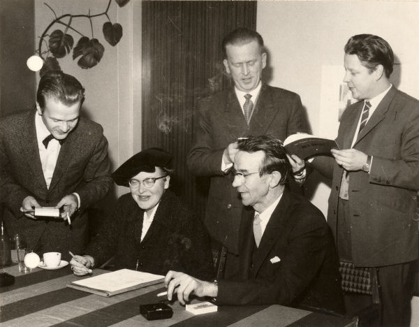 Ars Liberan, Kuopion kaupungin kuvaamataidelautakunnan ja Kuopion Taiteilijaseuran edustajat tarkastelevat Kuopion taidenäyttelykalenteria keväälle 1960. Henkilöt vasemmalta: Unto Heikkinen, Saila Niskanen, Seppo Rissanen, Olavi Rysä ja Rauni Mollberg.